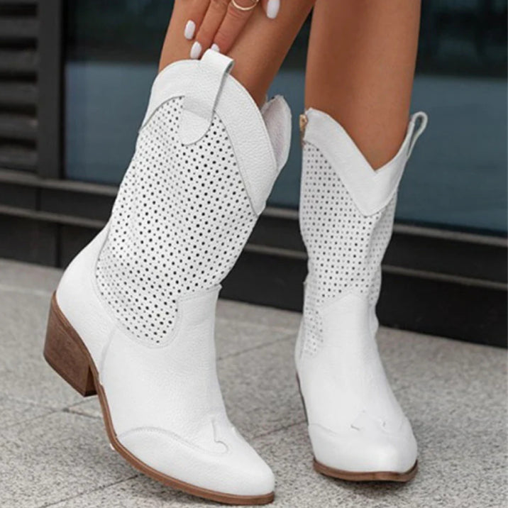Botki Josiane wprowadzają klasyczne kowbojskie wibracje na nowy poziom mody. Dzięki białemu kolorowi, wyszukanym detalom perforacji i stabilnemu słupkowemu obcasowi, te buty są idealne dla tych, którzy szukają komfortu i wyrazistego stylu. Niezależnie od tego, czy odwiedzasz festiwal, czy chcesz nadać swojej codziennej stylizacji charakteru – Josiane dodaje twojemu wyglądowi osobowości, stylu i pewności siebie.